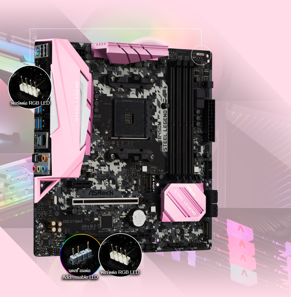 • สนับสนุน AMD ซ็อกเก็ต AM4 Ryzen™ 2000, 3000, 4000 G-Series, 5000 และ 5000 G-Series Desktop Processors